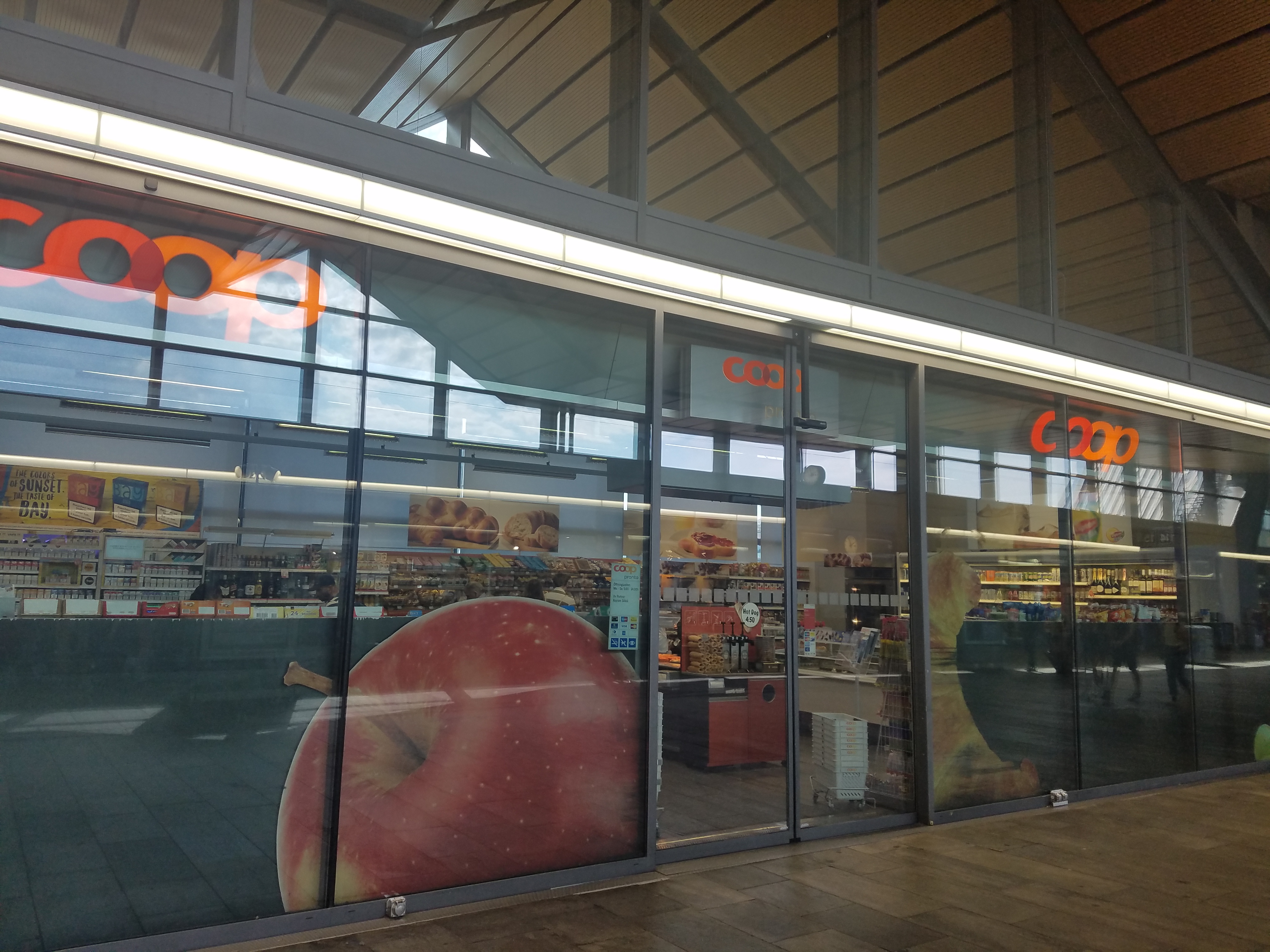 So along with getting real food at the station Migros, or snacks at the pretty well-stocked-but-not-a-grocery-store Coop Pronto convenience and liquor store (Migros is officially dry; more about that below), I could also easily acquire overpriced muffins or takeaway sandwiches, German-language romance novels, Swiss Lottery tickets, low-end candy, greeting cards, or an umbrella on a Sunday if I had to. And our beloved Turkish corner store, as noted, can supply us with anything that has ever been pickled, as well as an interesting but not comprehensive selection of international delicacies, and a small range of household products, seven days a week.