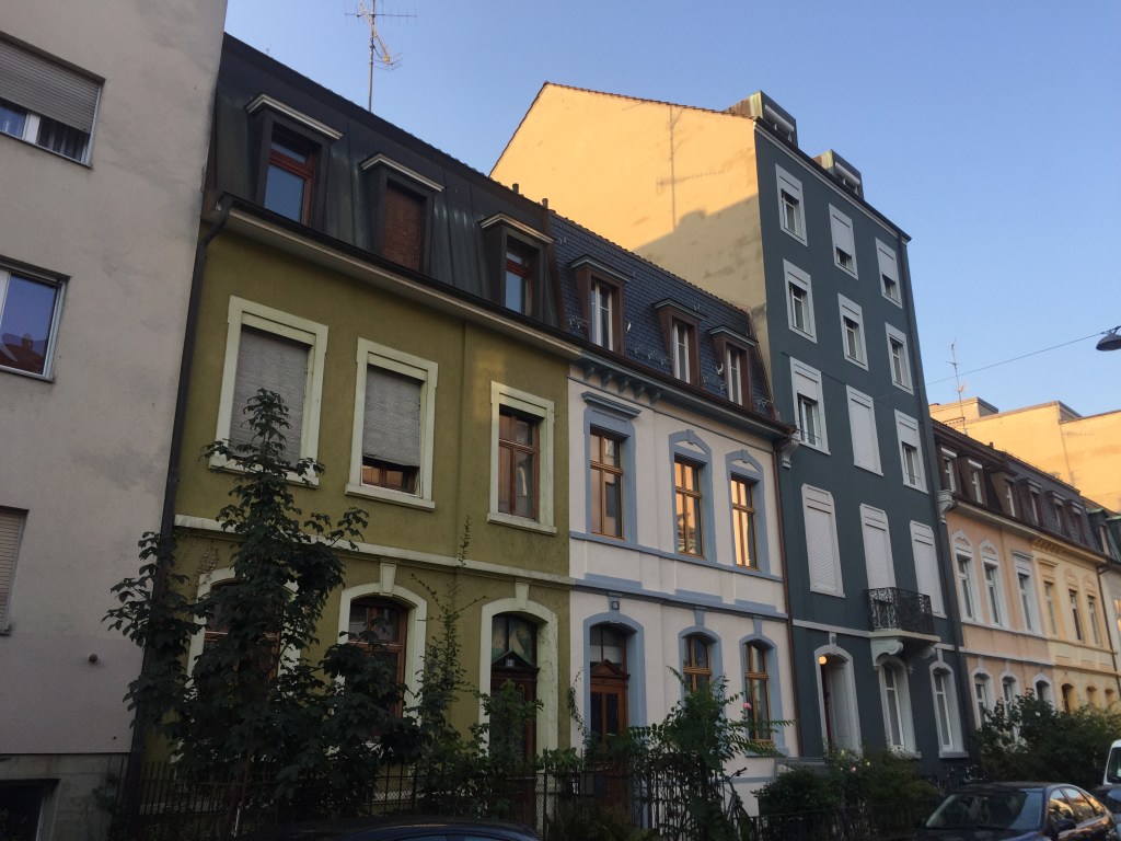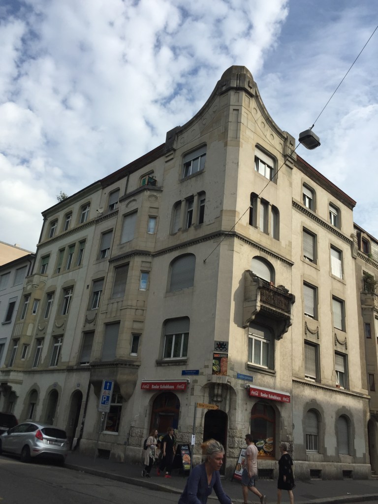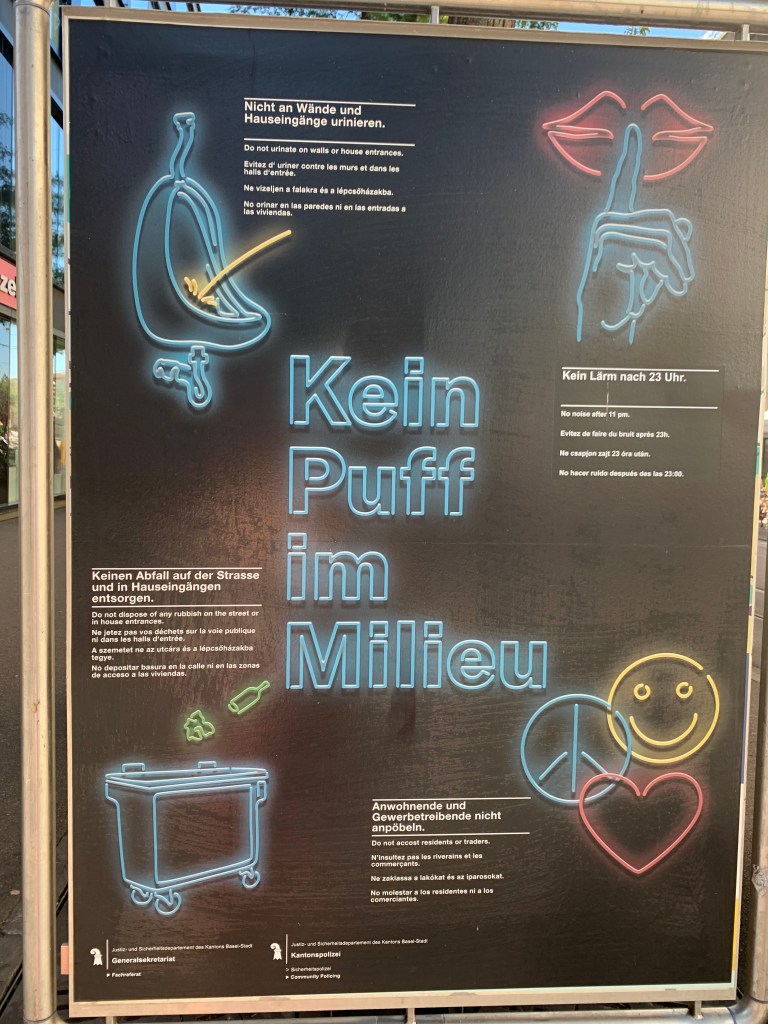 It is true that my block is not very pretty; we live nearly across the street from the convention center, among the city’s largest and least attractive pieces of architecture. And our end of our street is a largely commercial rather than residential strip, built up mostly in minimalist Swiss modern styles, nondescript concrete and glass and steel boxes that sometimes give a rather Soviet impression. It’s also true that our nearest square is popular with people who enjoy drinking cheap beer on the street in the morning (and more about street drinking, which is not against the law here, in another post); a nonprofit organization that serves addicts and the poor has established an Alki-Stübli, or “Alky Tavern,” essentially a dedicated wino zone, including former phone booths repurposed into tiny, socially-distanced indoor lounging areas for use in inclement weather, next to the kiosk there. Basel’s little red light district is also nearby. And on the subject of violence, statistics suggest that Kleinbasel may be the most dangerous neighborhood in Switzerland, with more than a dozen violent crimes per 1,000 residents in 2018: our old stomping grounds of San Francisco had fewer than six times as many.