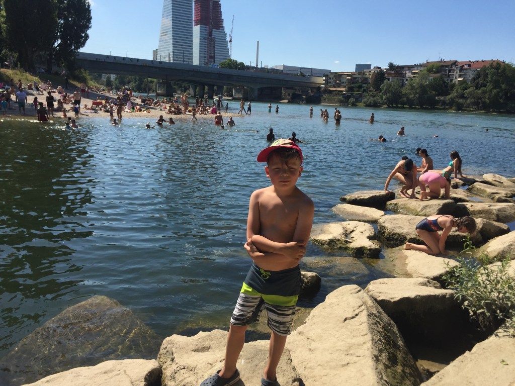 Our son Simon on a summer camp excursion to where the Birs meets the Rhine. He officially hated it, but it still took me an hour to get him away from the riverside to head home. This rocky bathing area and the sandier beach behind Simon are both adjacent to a large, grassy park known as the Birskoepfli that is crowded with people grilling and chilling for at least a quarter of the year.