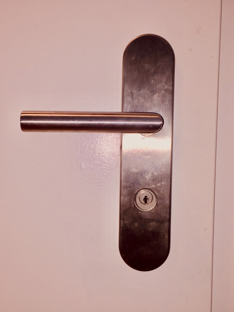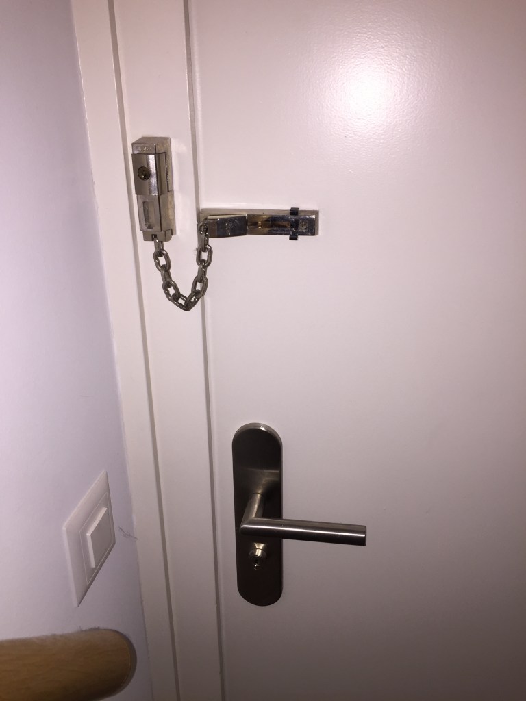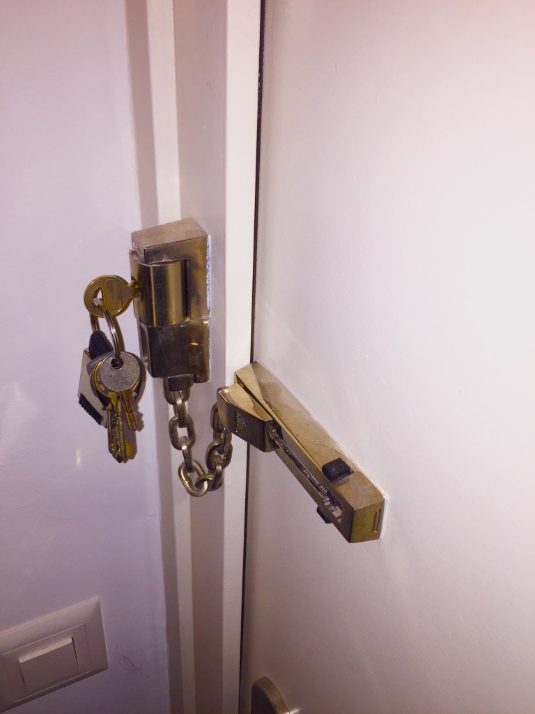 Therein lay a problem. If I locked the door with my key from the outside using the deadbolt attached to the door handle, it could only be unlocked from the inside with another key. Unlike a modern American- or international-style springbolt, you couldn’t just open the door by turning the inside doorknob, nor was there a switch anywhere on the door handle to unlock it. There was no automatic opening switch on the knob inside, such as you find on most modern springbolts, so anyone I locked in couldn’t get out until I came back. This was particularly challenging very early in our tenure in Switzerland, when we had only one set of keys for the apartment.
