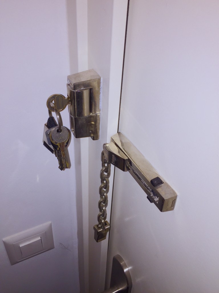 I’ve since learned that this one-way deadbolt phenomenon is not universal among Swiss apartments, thankfully; all of the locks on the two doors to our permanent apartment (one leading directly to our private sixth-floor stop for the elevator, and one leading to a fifth-floor landing) can be opened from either side. But only if people on both sides of the door have a key.