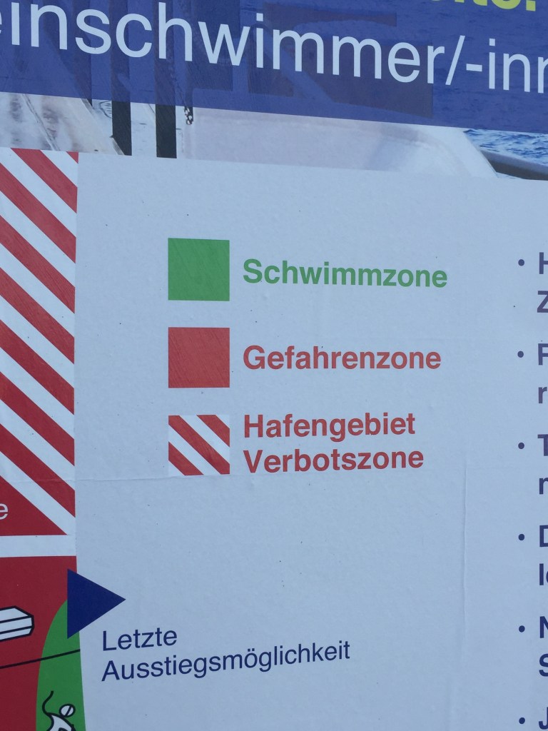 Is it safe? (Isn’t it a major international shipping channel?) The answer to these questions is yes, it’s safe enough if you’re careful, and yes, as the second longest river in Europe and a primary transit artery through one landlocked and one double-landlocked country (Liechtenstein), it’s an important channel for freight, some passenger transport, and those river cruises you always see advertised on PBS, if you’re American. Basel officially designates specific, clearly mapped parts of the river as swimmable, marking the shipping lanes and particularly dangerous bridge pylons that should be avoided as off-limits. And virtually all Rhineswimmers adhere to these guidelines, sticking close to the banks on a couple of popular stretches.