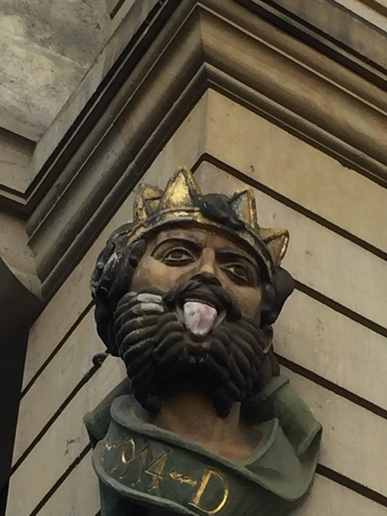 (The marriage of the two municipalities seems to have been as contentious as the divorce of Basel-Land from Basel-Stadt; the golden-crowned crowned, clockwork Lällekönig, or “tongue king” figurine has been blowing a mechanical raspberry at the lower classes of Kleinbasel from a perch near the Grossbasel side of the Mittlere Brücke [Middle Bridge] since at least 1658, although the king currently rolling his eyes at us is a 20th-century replica. Giving as good as it gets, when the heraldic mascots of Kleinbasel’s three ancient honorary societies hold a procession through the streets every January, the Wild Maa [Wild Man, also Wildi Maa and Wilde Maa] cruises down the Rhine on a barge accompanied by fifes and drums and cannon fire, swinging a tree branch and keeping his back firmly to Grossbasel.)