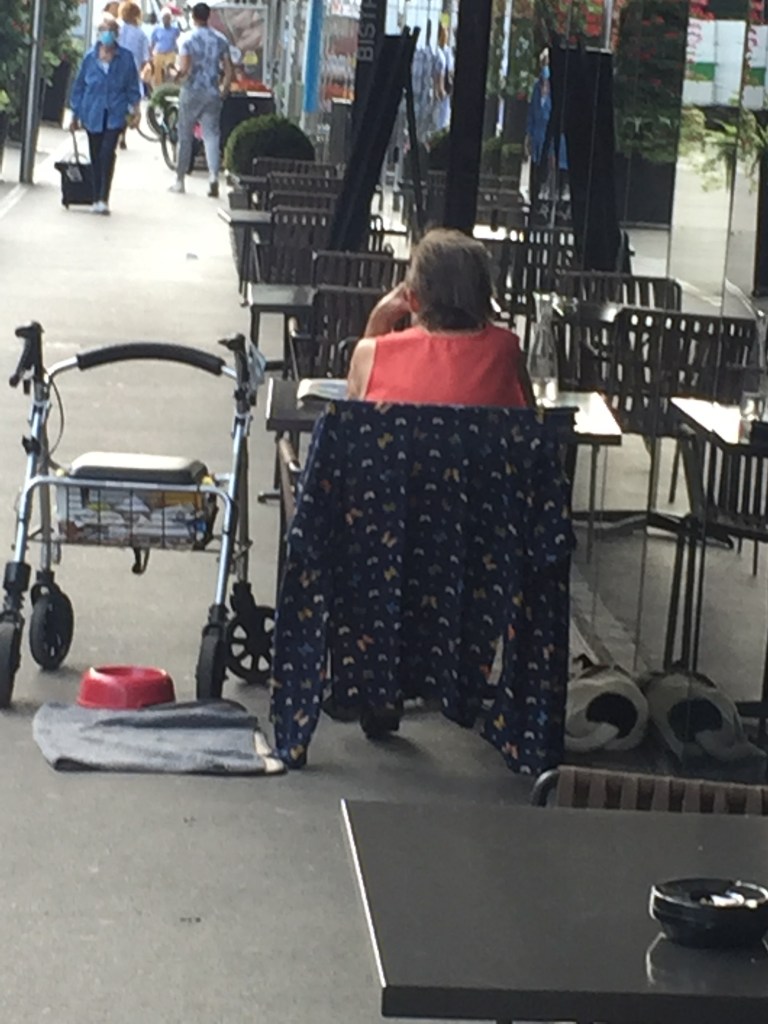 A woman I would describe as a little old lady (she is quite small, although her age is really indeterminate; I can say for certain only that she has the short graying hairstyle popular among ladies over 70 in Switzerland, and she walks with the aid of a walker, albeit a walker that is sometimes laden with grocery bags, mail, or reading material, and thus functions more like a trolley) visits a sidewalk table at the Bistro Europe every afternoon, usually also with a dog, occasionally with another little old lady friend. Bistro Europe seems an odd choice for a preferred haunt to me, because it is the lobby restaurant attached to a Pullman Hotel. It doesn’t look like a bad restaurant, necessarily, and it clearly gets a good lunchtime crowd of men and women in suits eating overpriced pasta, but I assume almost all of those folks are staying at the hotel. Only the little old lady knows why she chooses a hotel bar as a regular destination when there are a literal dozen additional options within a few hundred steps, and at least three within twenty steps. Perhaps it’s because of the Pullman’s proximity to the tram stop (it’s about the closest sidewalk table to the transit point, although there’s an equally popular indoor venue in the coffeeshop/bar in the lobby of the adjacent Coop supermarket, which gets other blue-haired folks in for regular coffees and drinks), and maybe they’re just especially nice to her dog. When she’s with the pooch, she brings a water bowl on her walker, and I assume the waiters fill it for her.