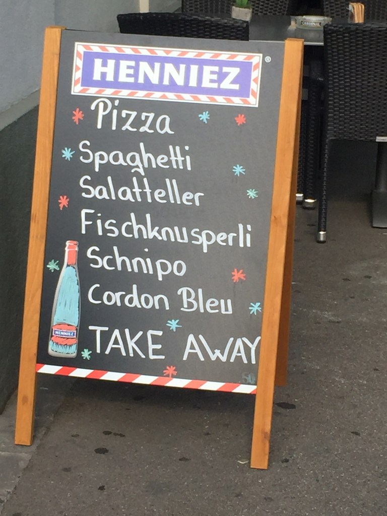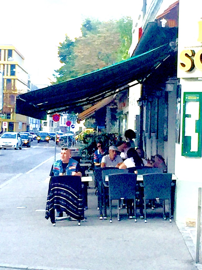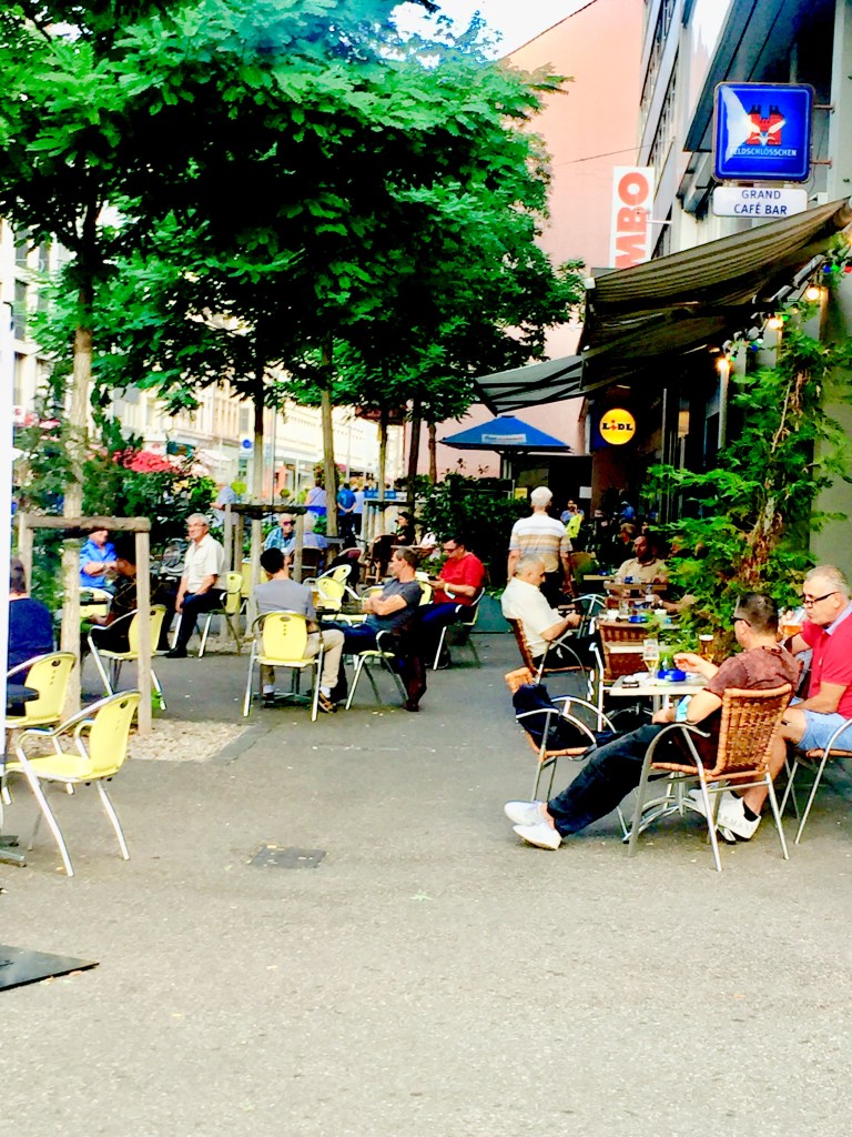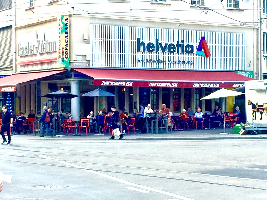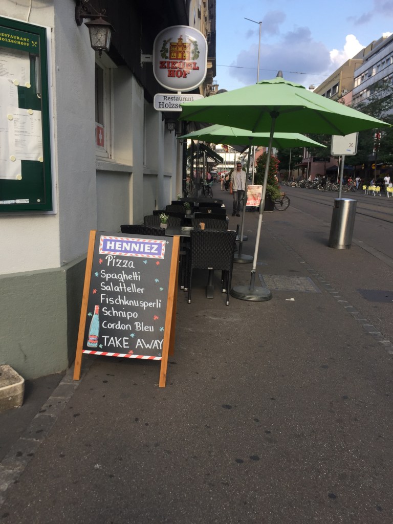 Despite not having a food culture that attracts (or maybe deserves) a lot of attention, though, the Swiss have a vibrant, thriving sidewalk cafe culture. Even when it costs six bucks (at the hipster food hall not far from us, a double espresso, one of my tipples of choice, will set you back CHF5.50, US $5.92 at this morning’s exchange rates; I have paid as much as CHF6, which is a whopping US $6.48), the Swiss will drink a cup of coffee on the street with the best of them, and they’ll eat too. Even before Coronavirus times, which have pushed even more tables and chairs out onto the pavements, the Trottoirs and squares have always been loaded for many months each year with places to sit outside and consume something.